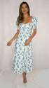 Indulge in luxury with Cedar, cut from stretch white and blue floral print in sustainable(BCI) cotton poplin for a fresh lightweight feel. Perfect for spring vacations and garden parties, its ultra-feminine silhouette is enhanced by the gathered cups for gentle support. The adjustable drawstring ties personalize the fit, while the puff sleeves and voluminous maxi skirt add a fun and floaty touch. Back zipper with hook and eye for perfect fit.